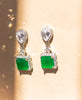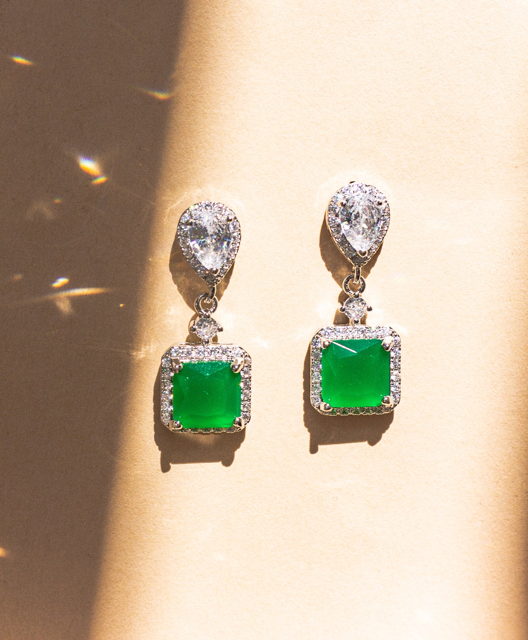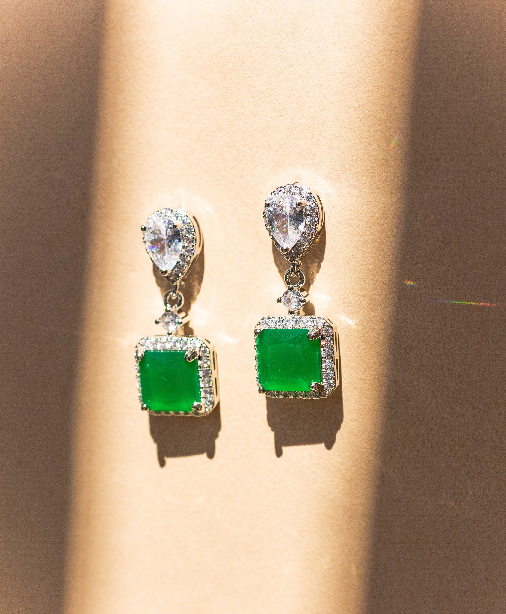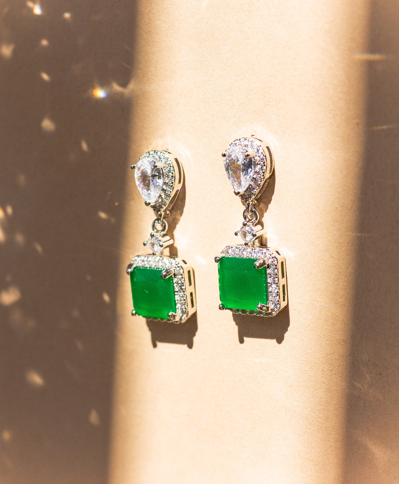 Pendientes elegantes estilo colgante, a base de cristal zirconia, en color verde esmeralda.