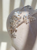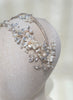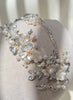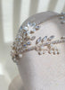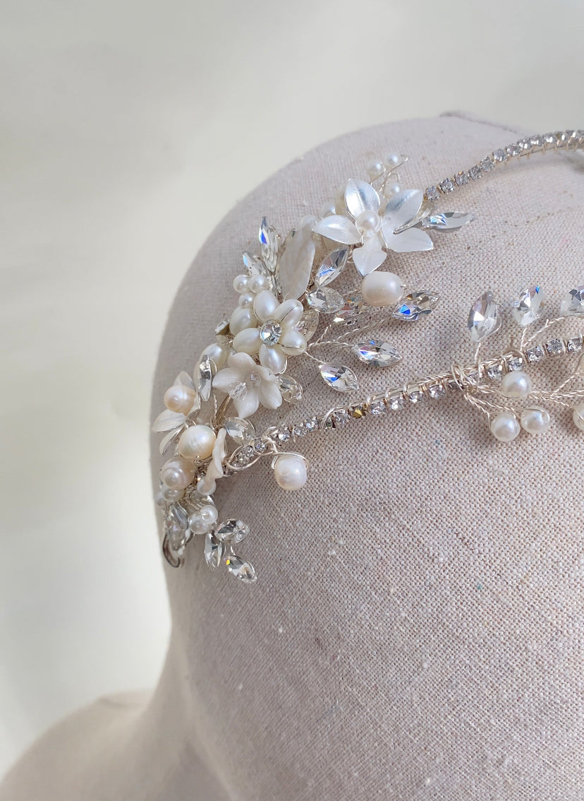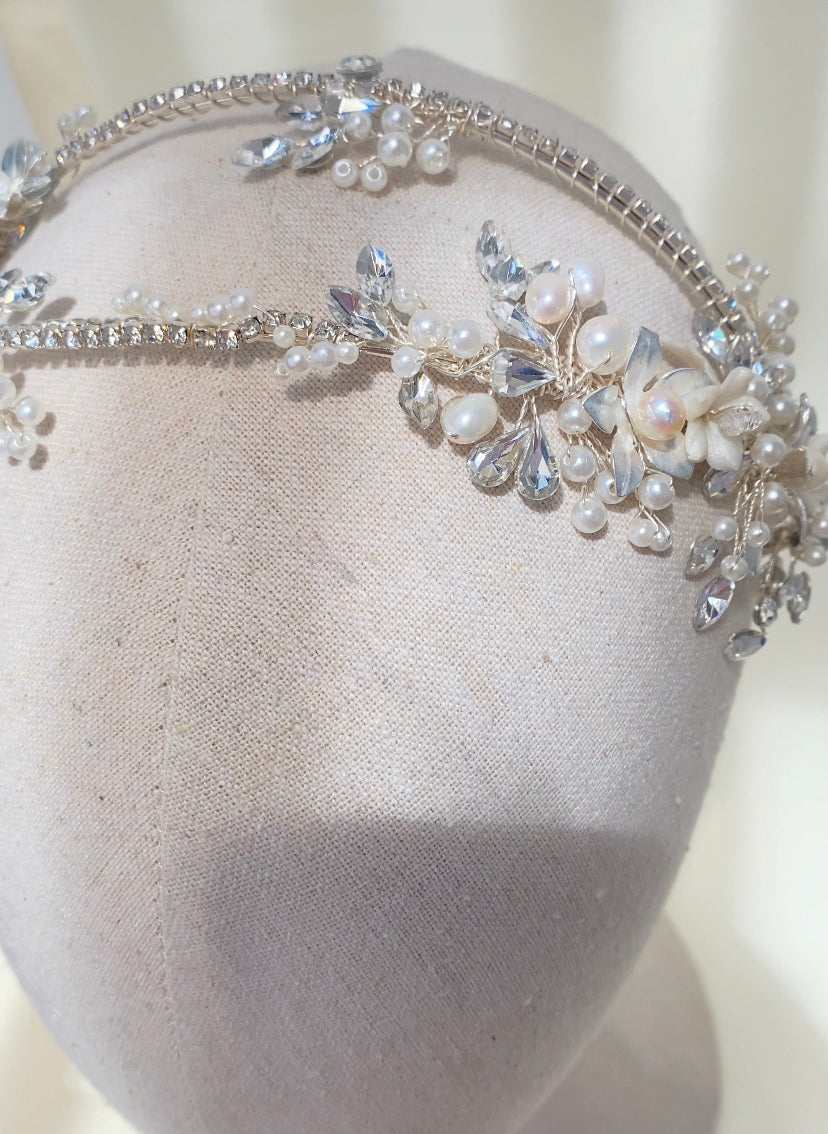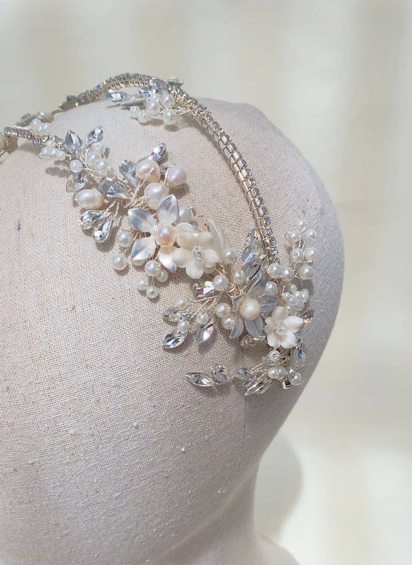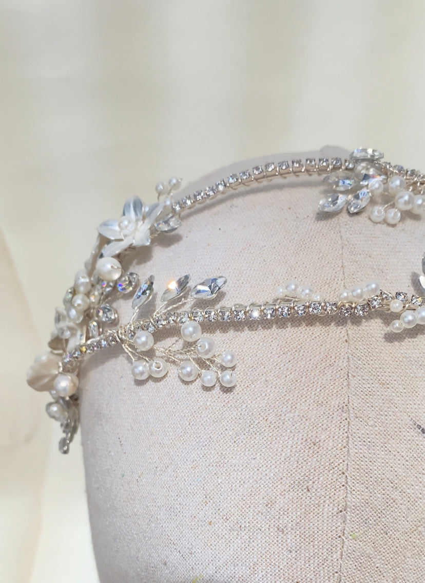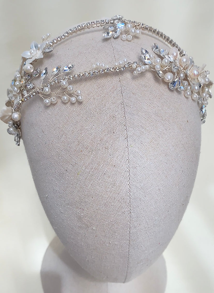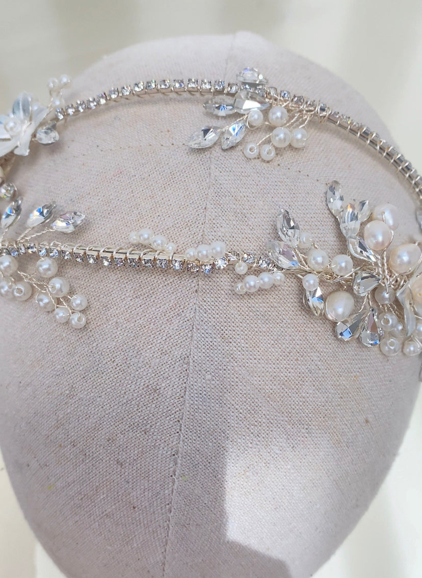 Diadema doble con base plateada y adornada con cristales, flores y perlas en distintas presentaciones.
