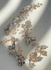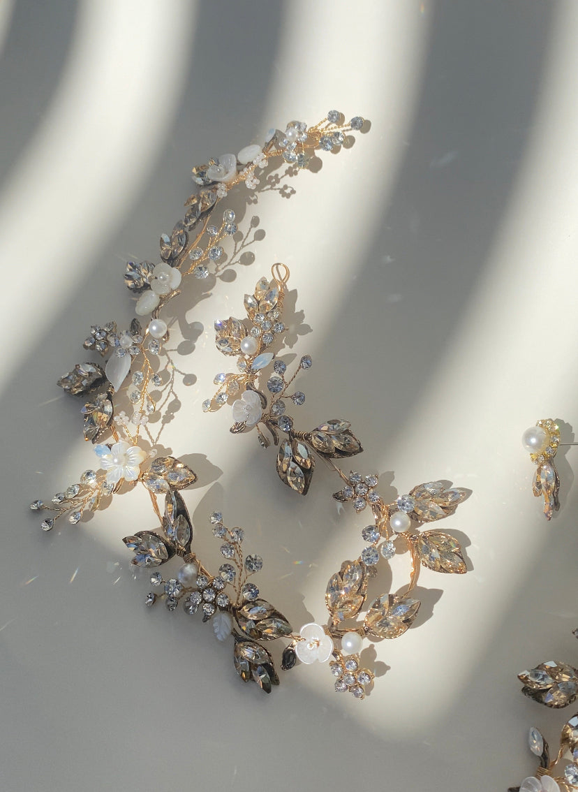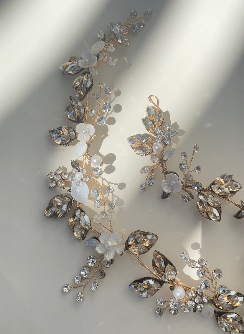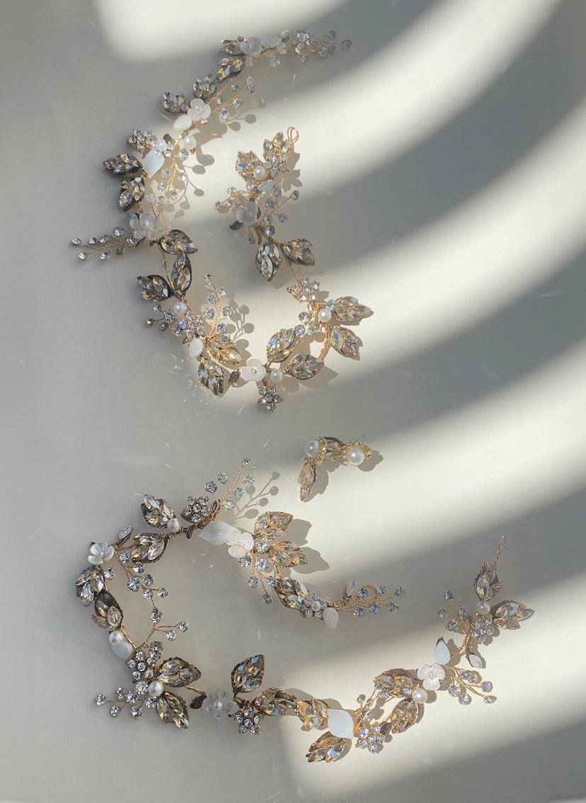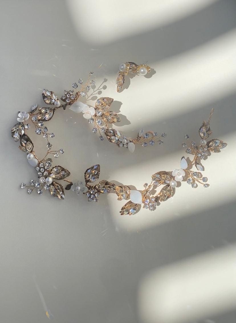 Guía clásica totalmente moldeable y ajustable a diferentes posiciones, diseñada con base de alambre dorado vintage, adornada con cristales, hojas, flores y perlas en distintas presentaciones.