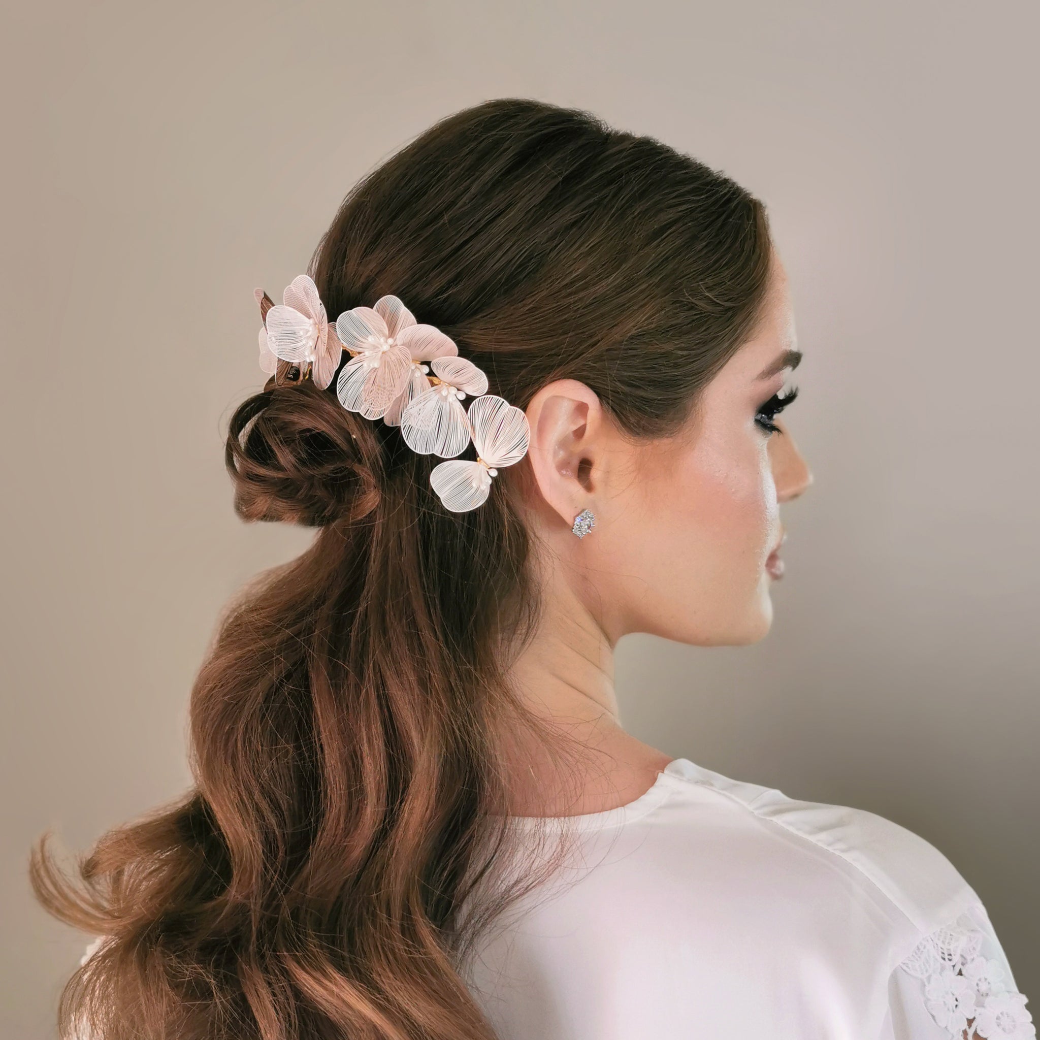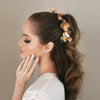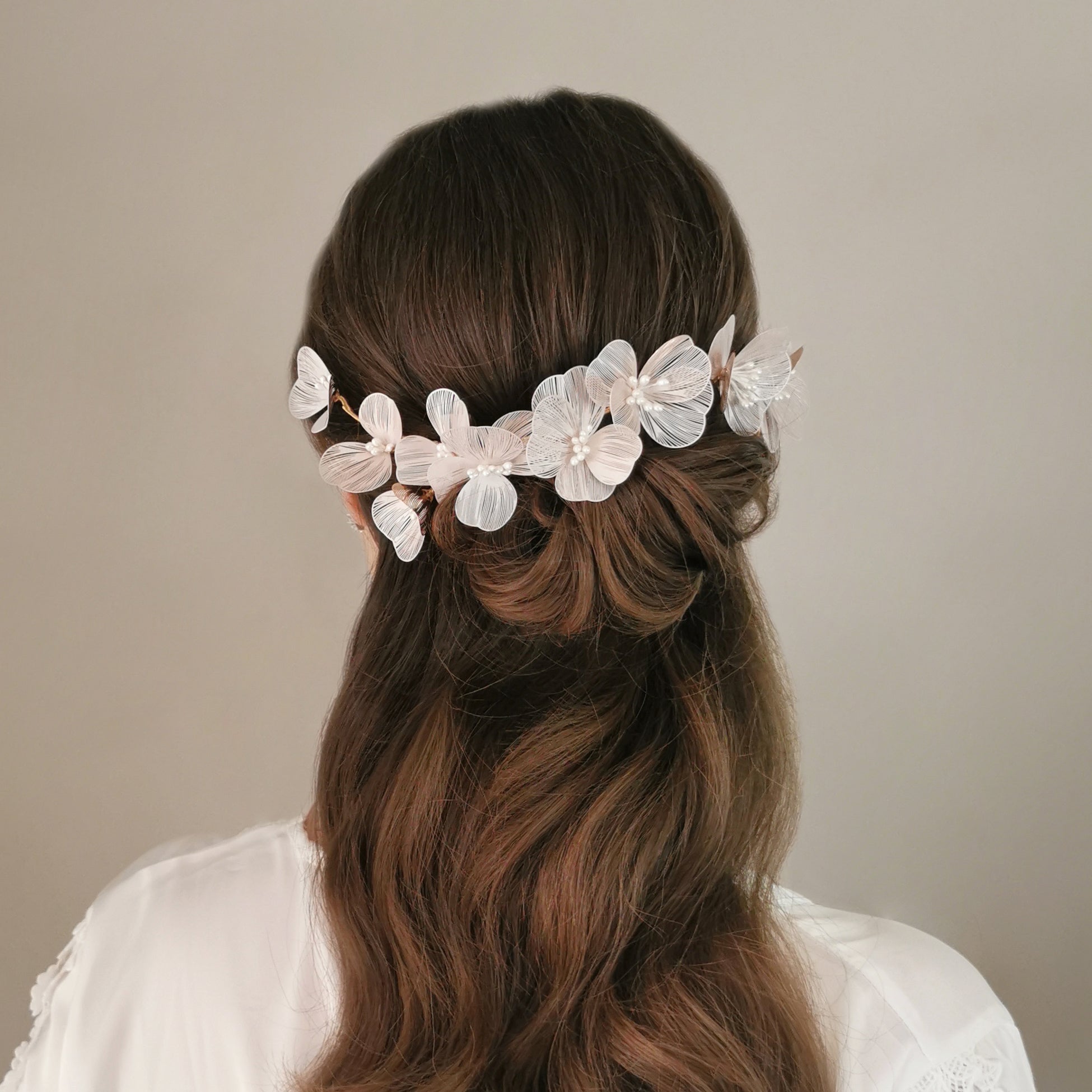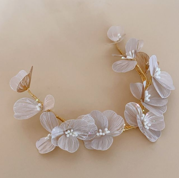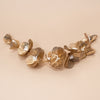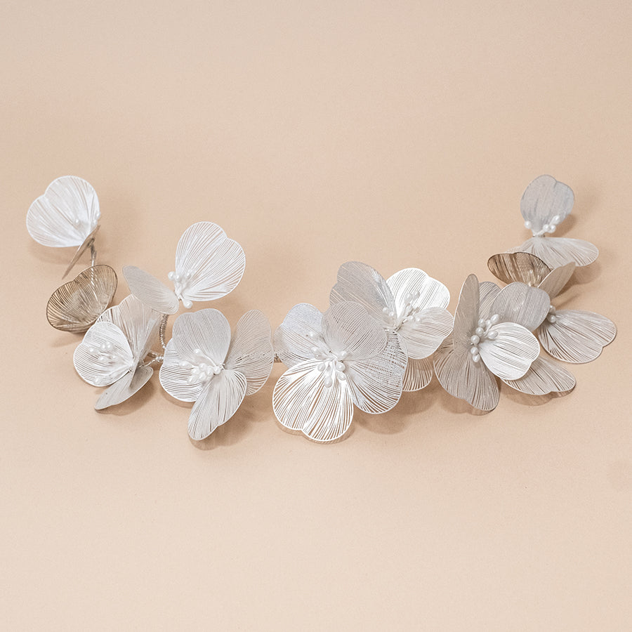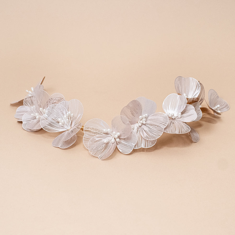 Guía estilo Bohemio - Romántico moldeable y ajustable a diferentes posiciones, con base de alambre, adornado con flores metálicas y capullos en tono perla.