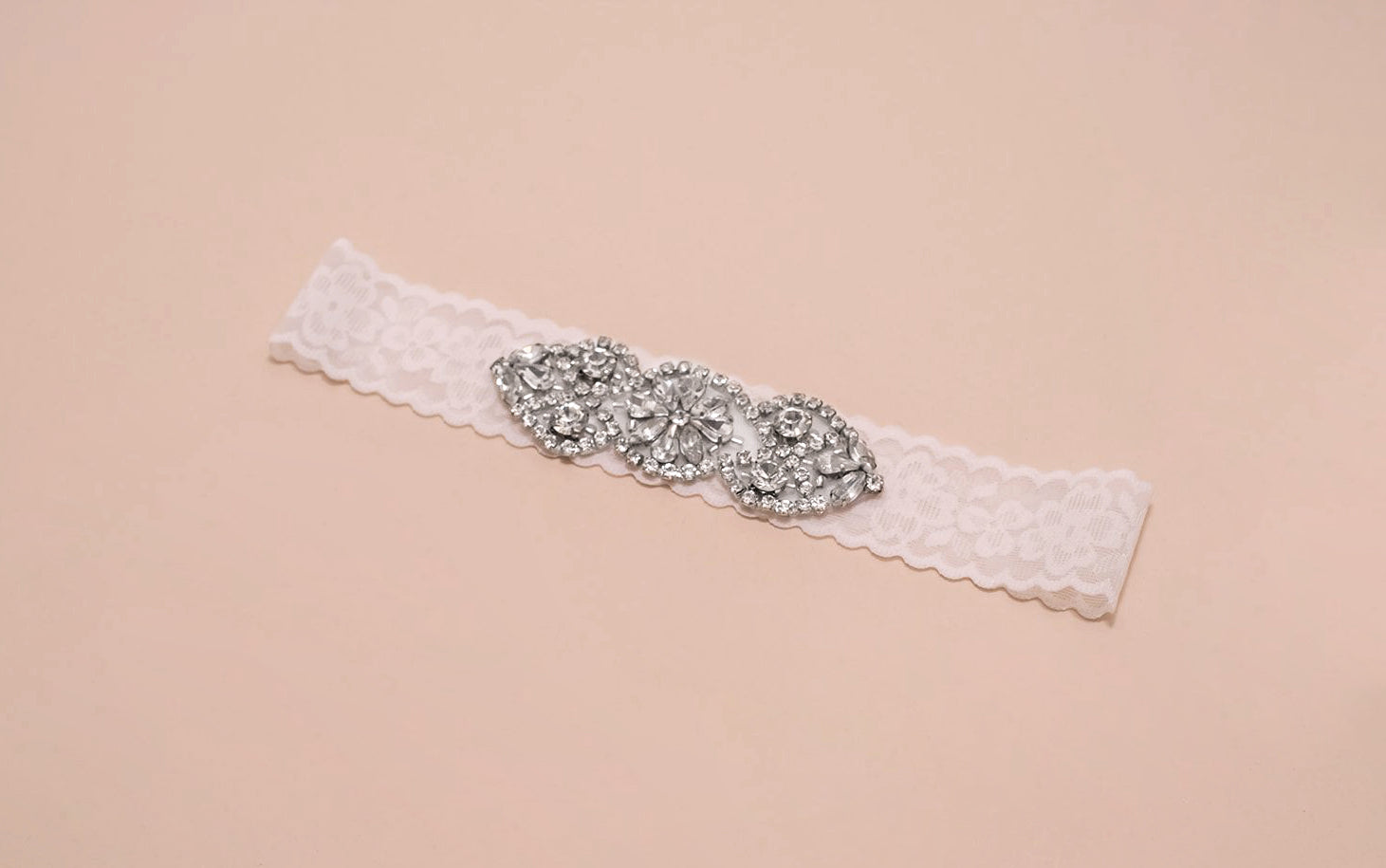 Liguero de encaje adornado con cristales y perlas en distintas presentaciones.