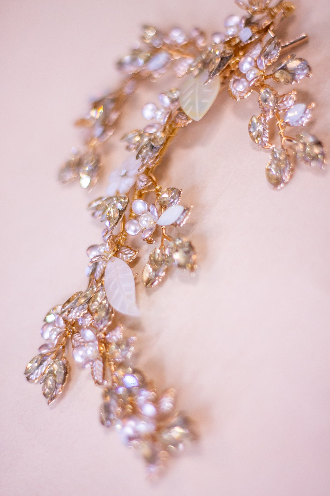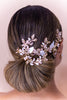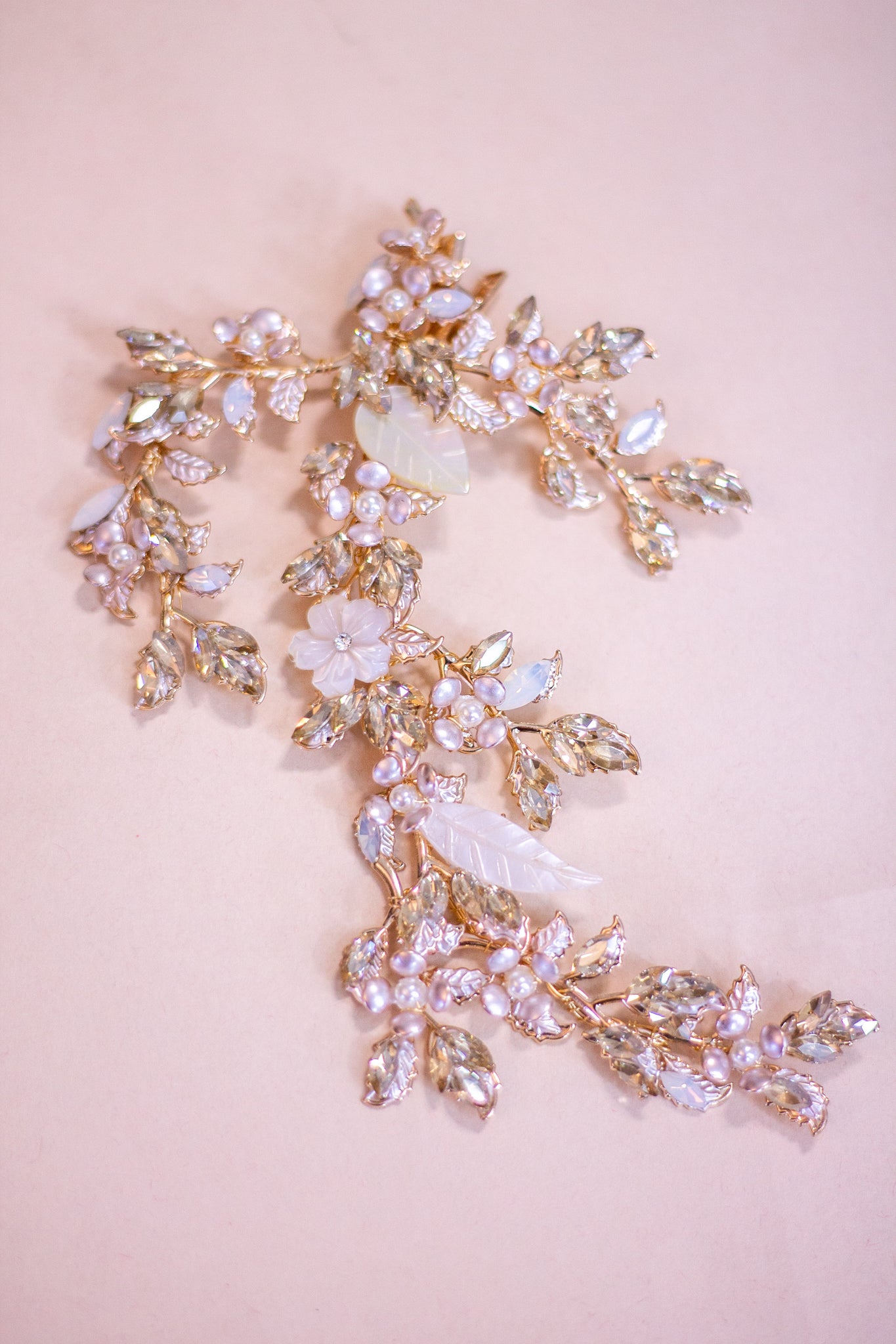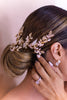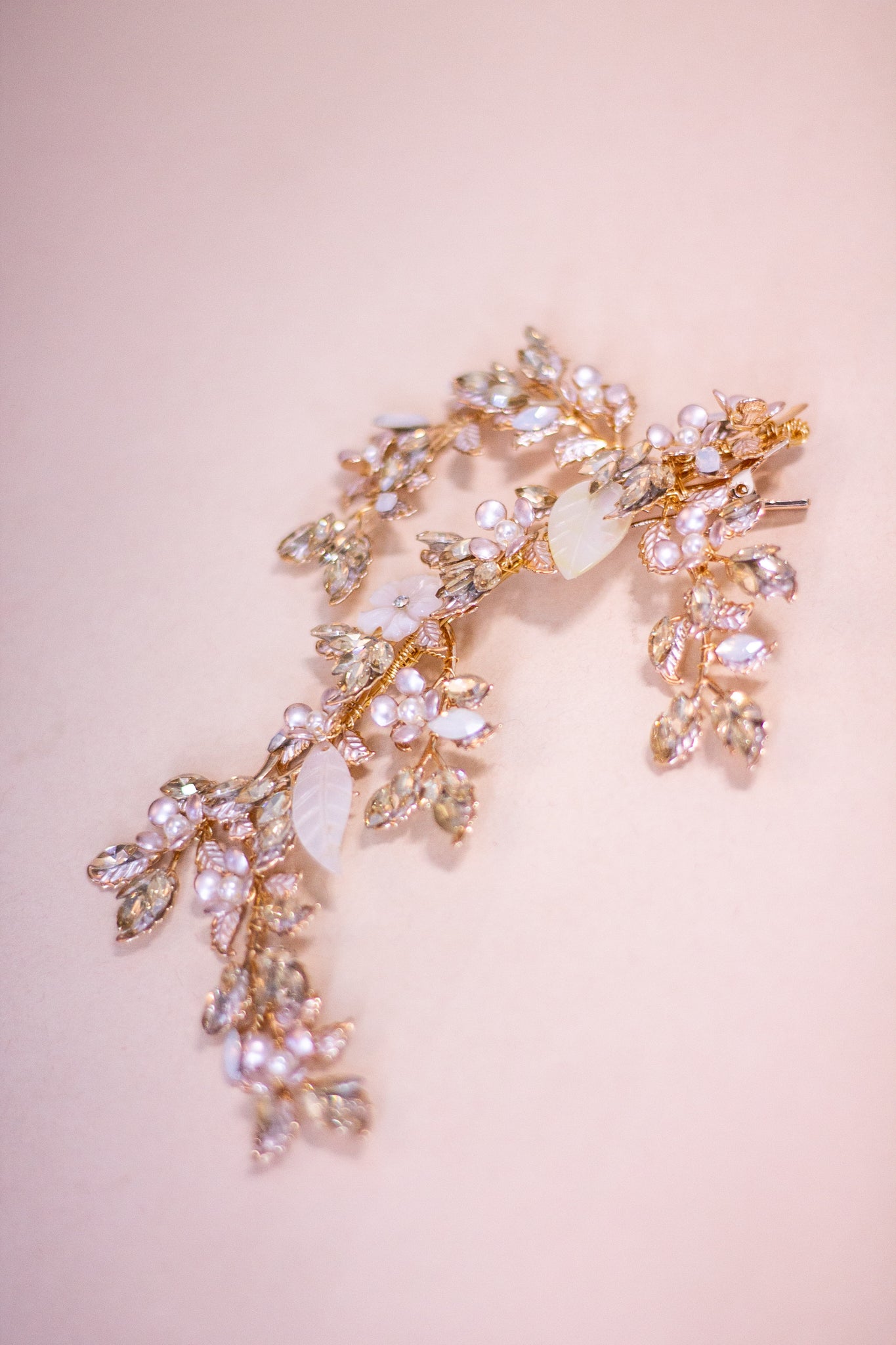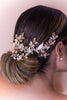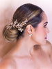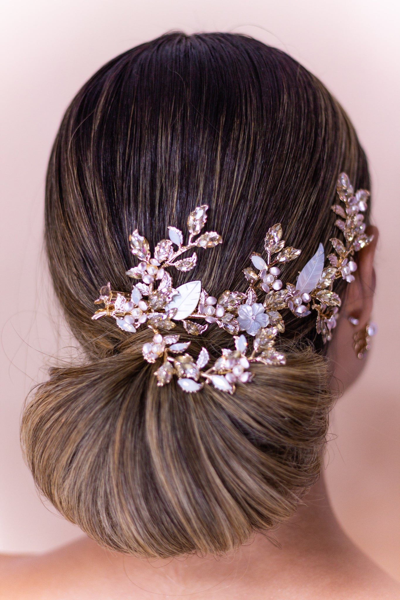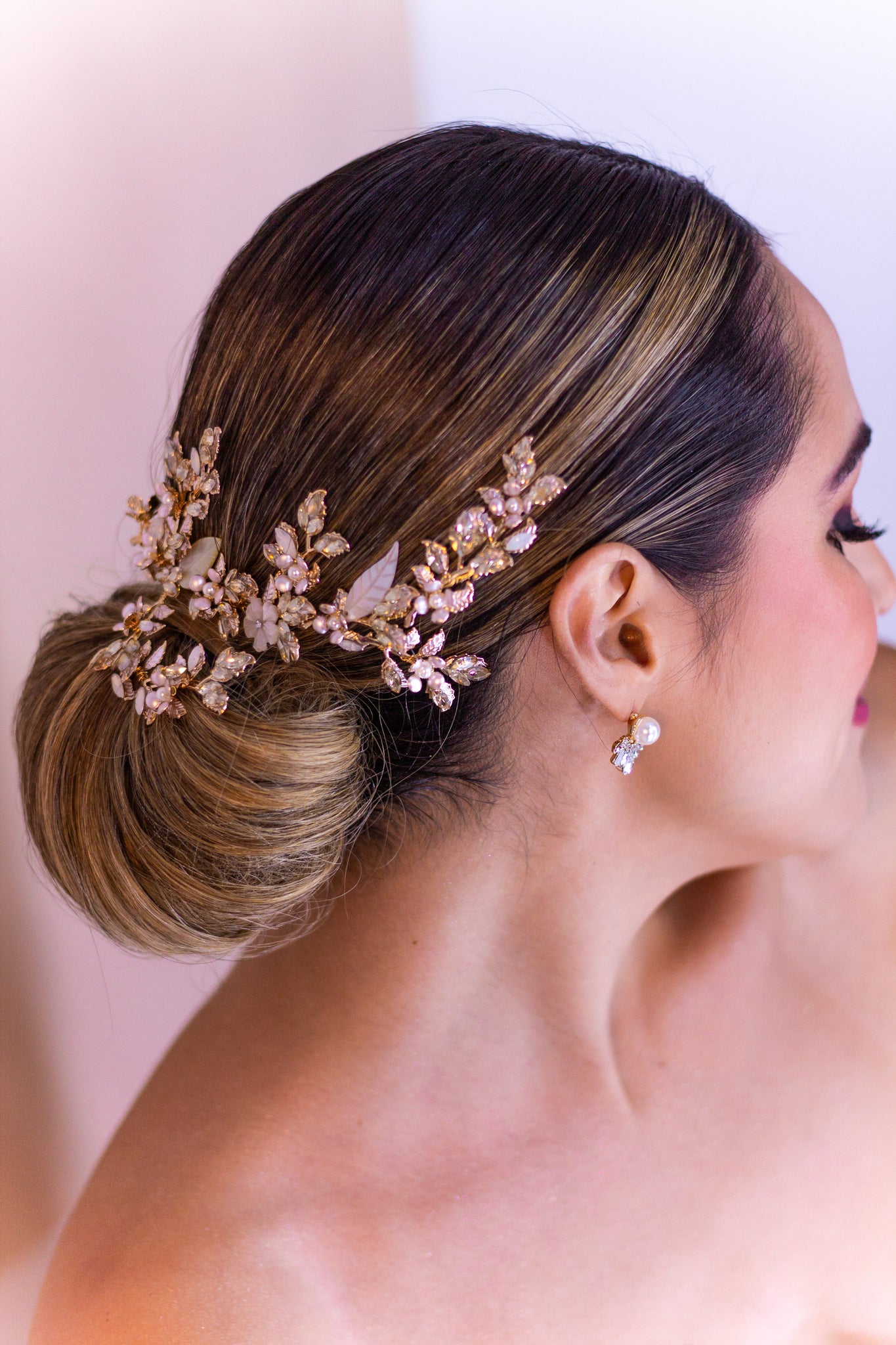 Peineta única y hecha a mano por Ana Rebeca, adornada con cristal Swarovski en tono champagne y perla.