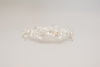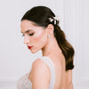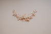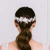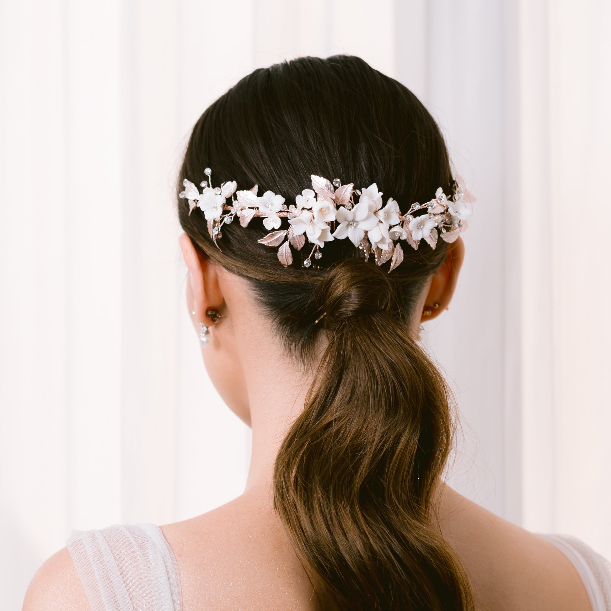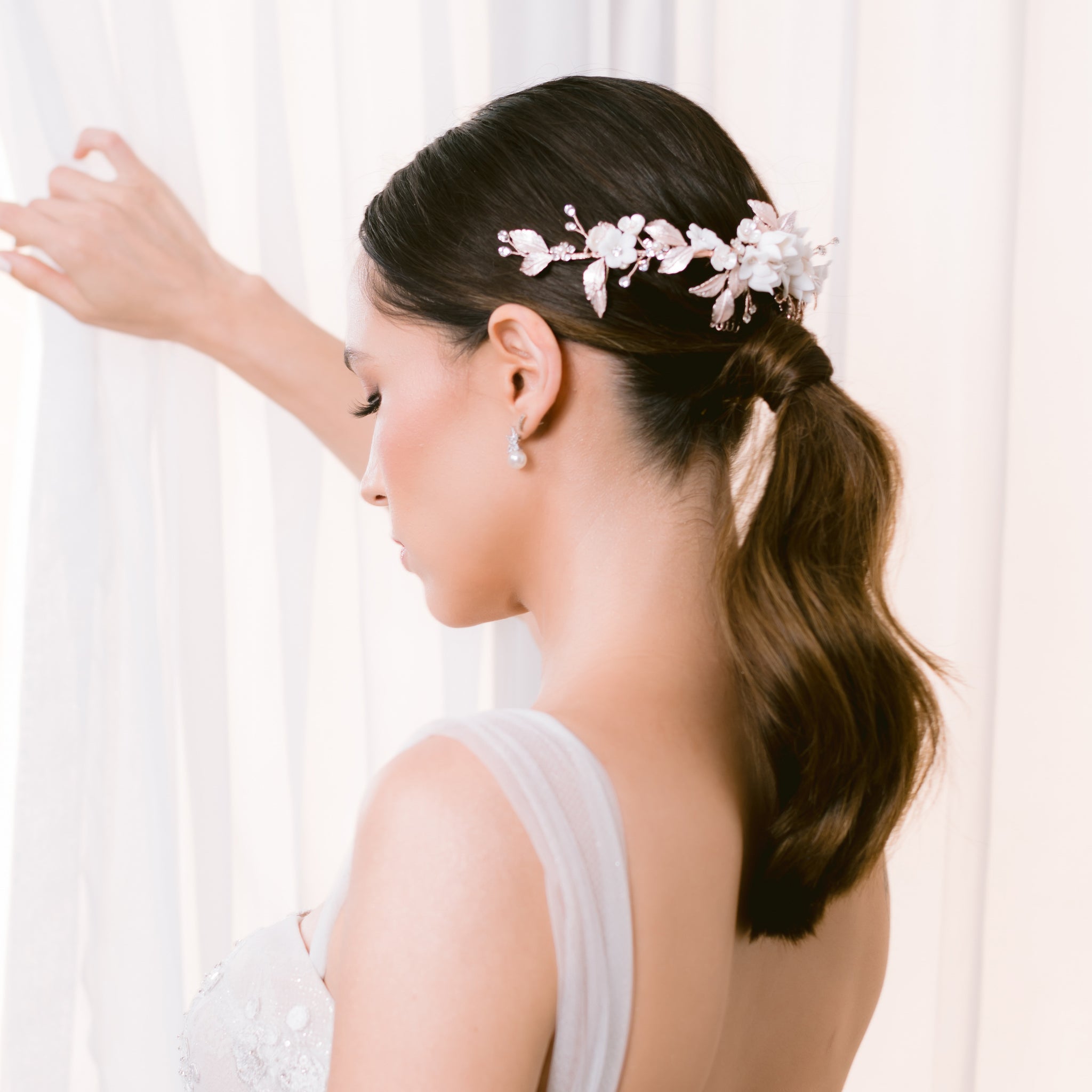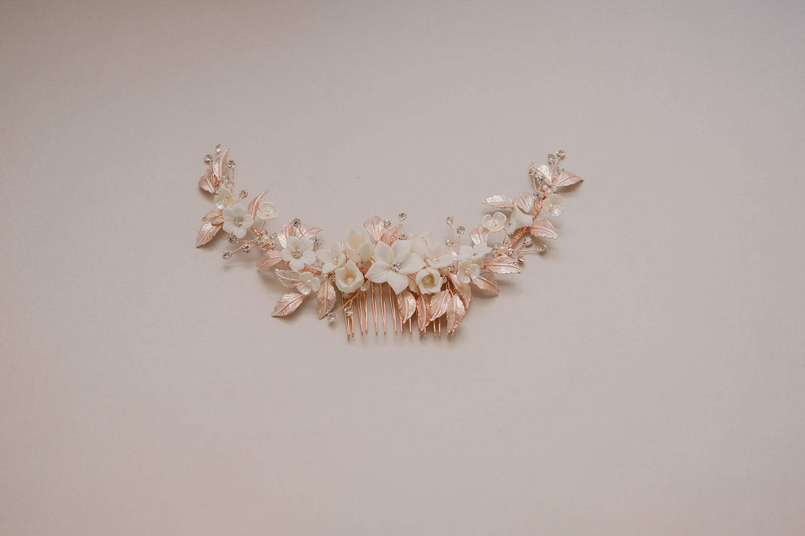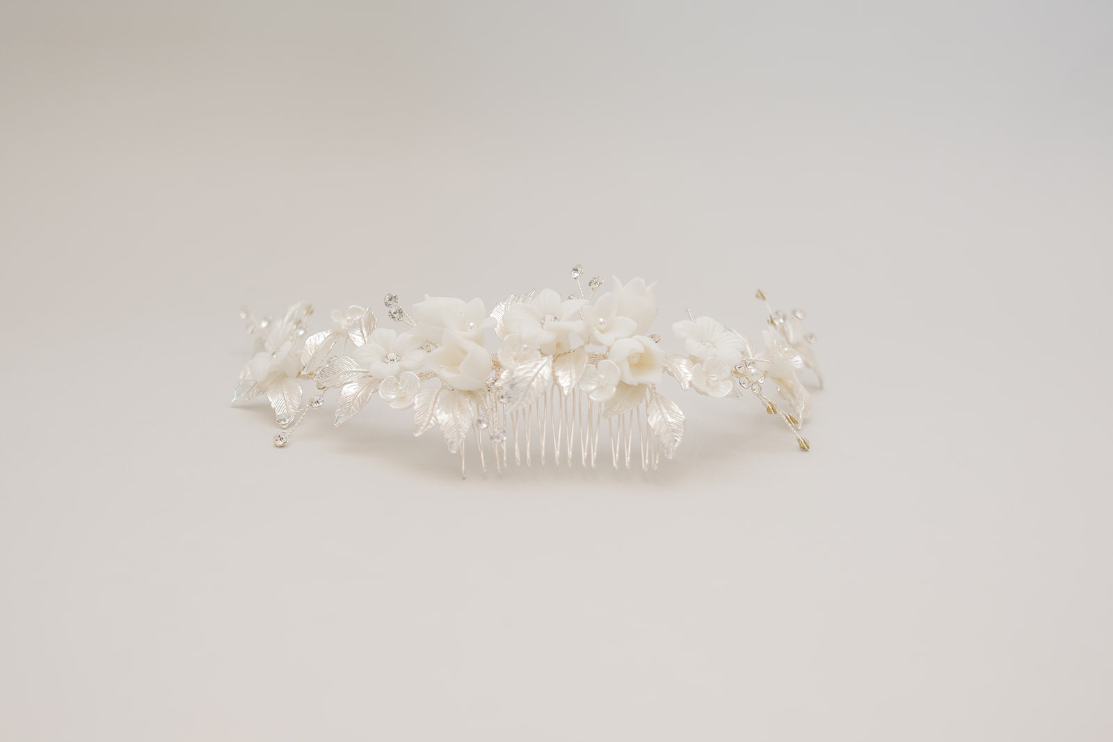 Peineta adornada con flor de porcelana y hojas metálicas.