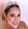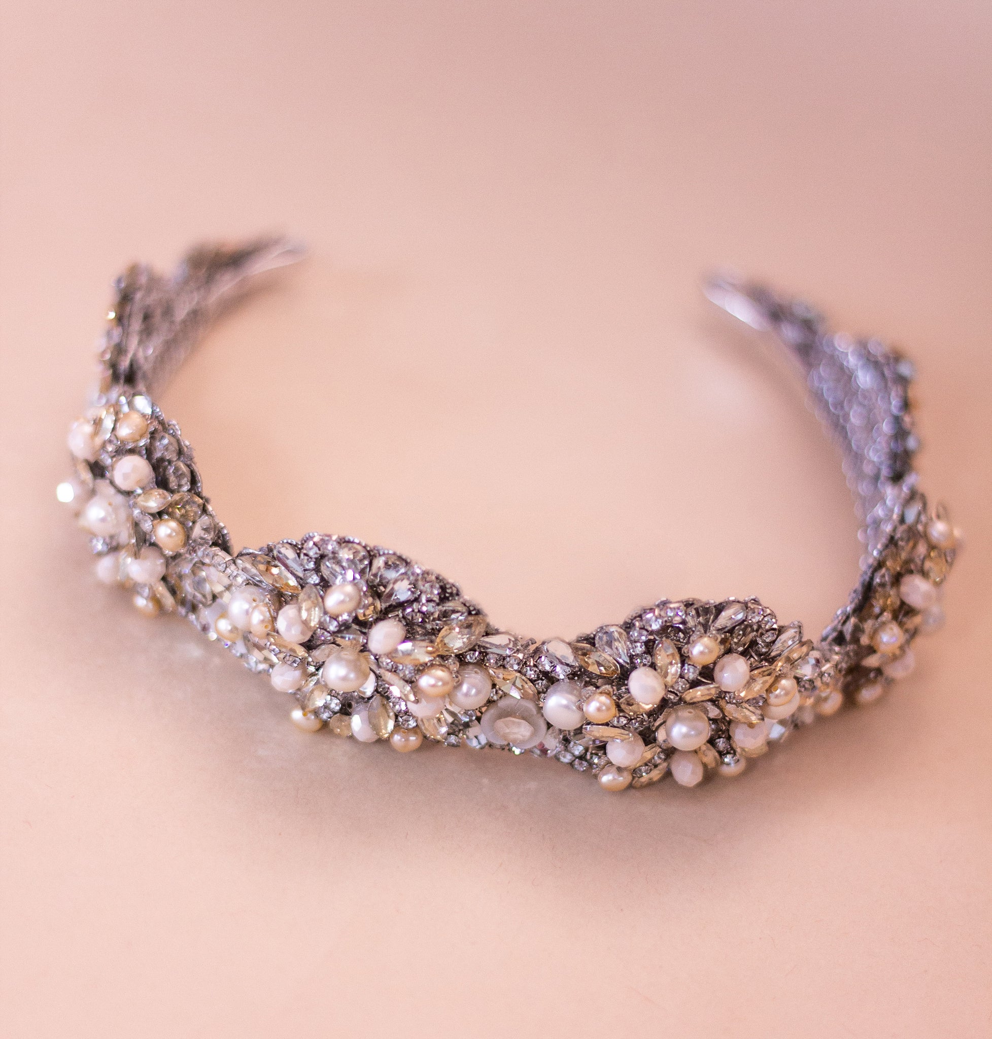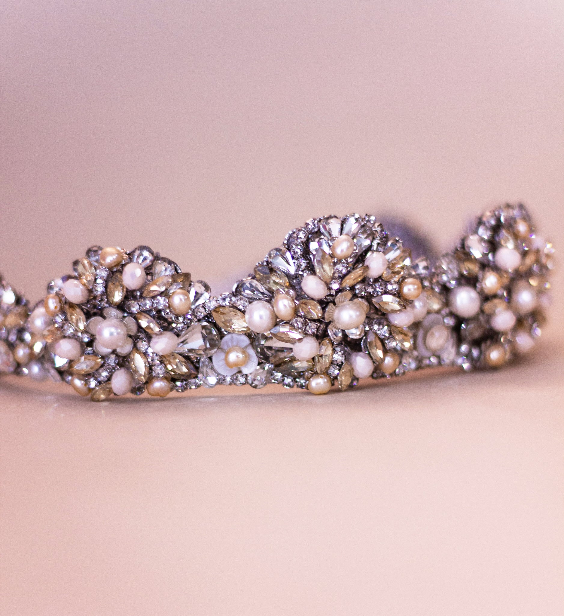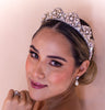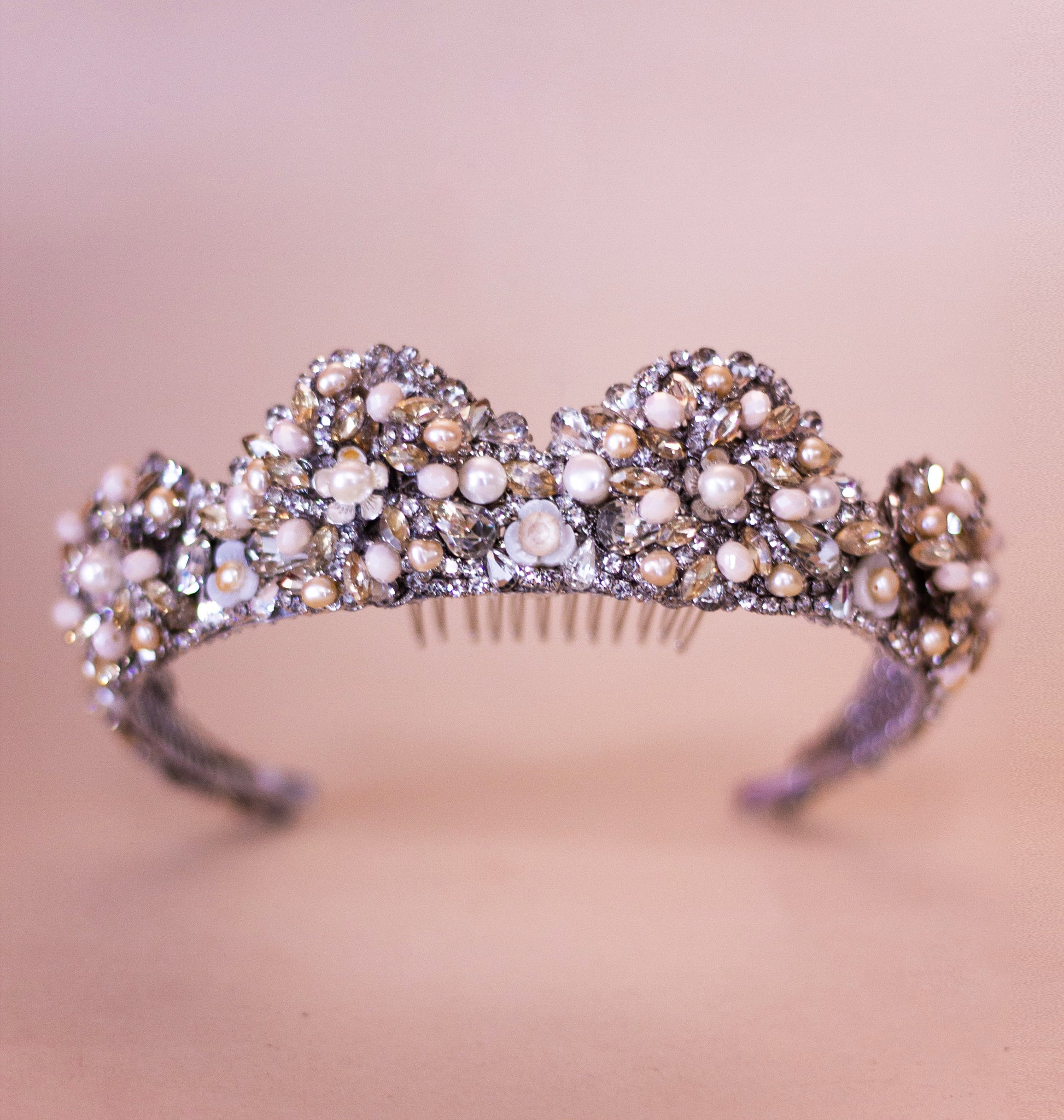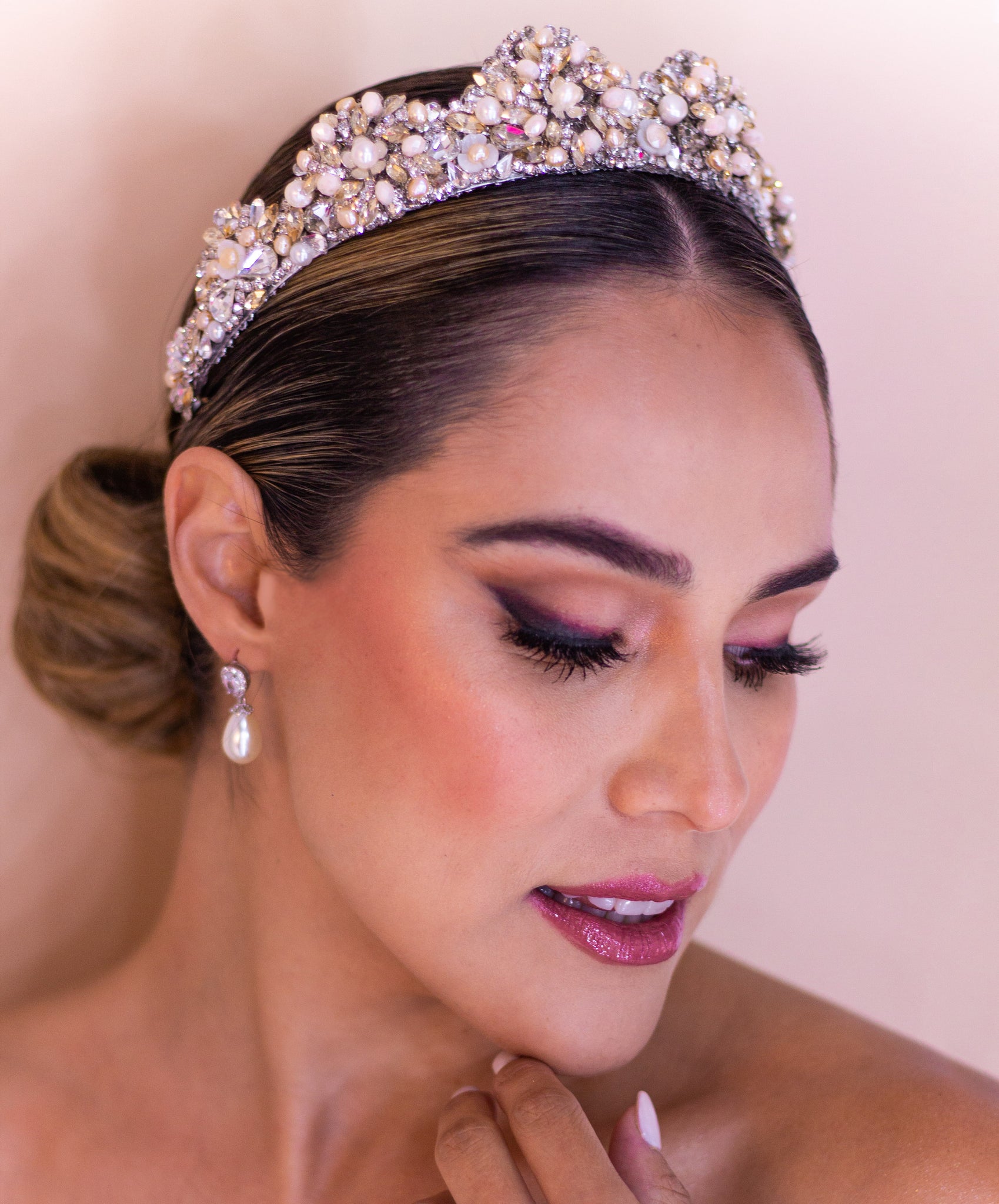 Corona en forma de curvas, única y hecha a mano por Ana Rebeca, adornada sobre base plateada con detalles en volumen, principalmente cristal Swarovski y perlas en distintas presentaciones.