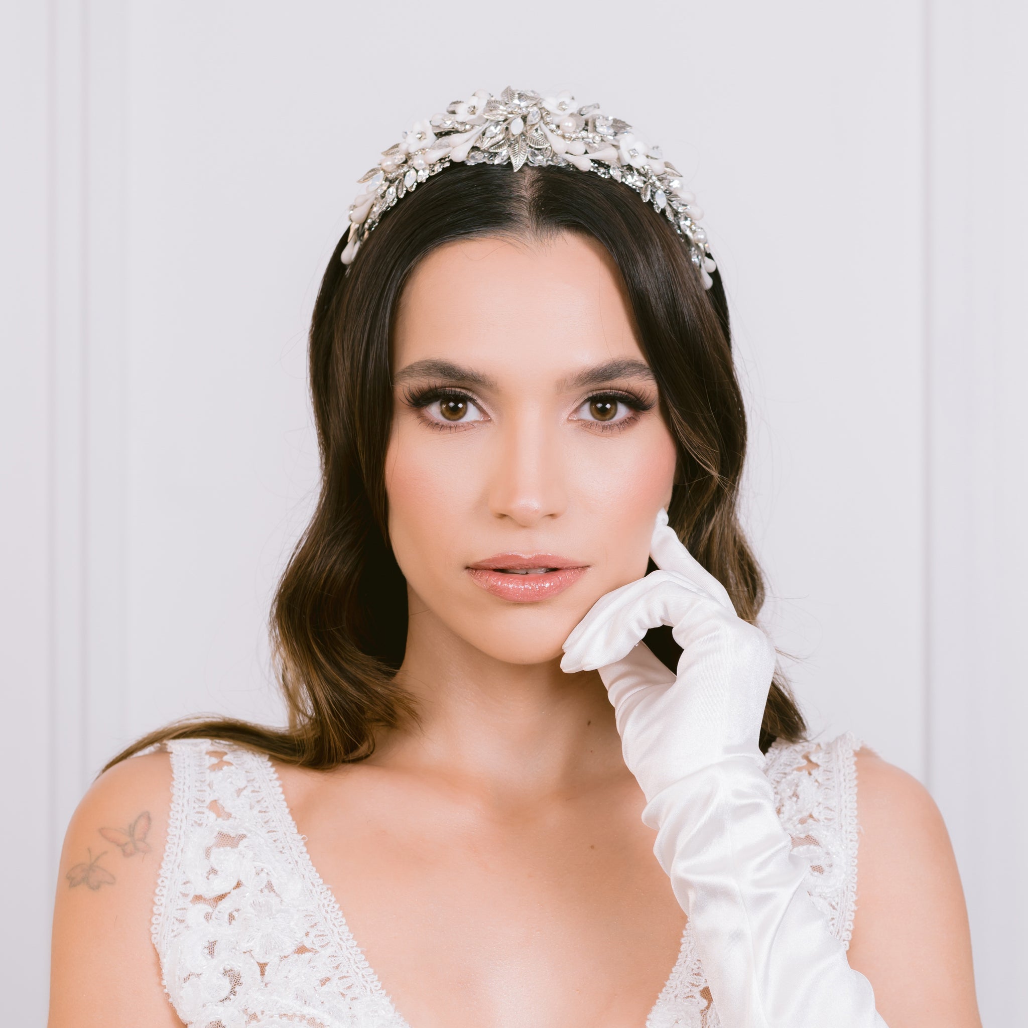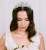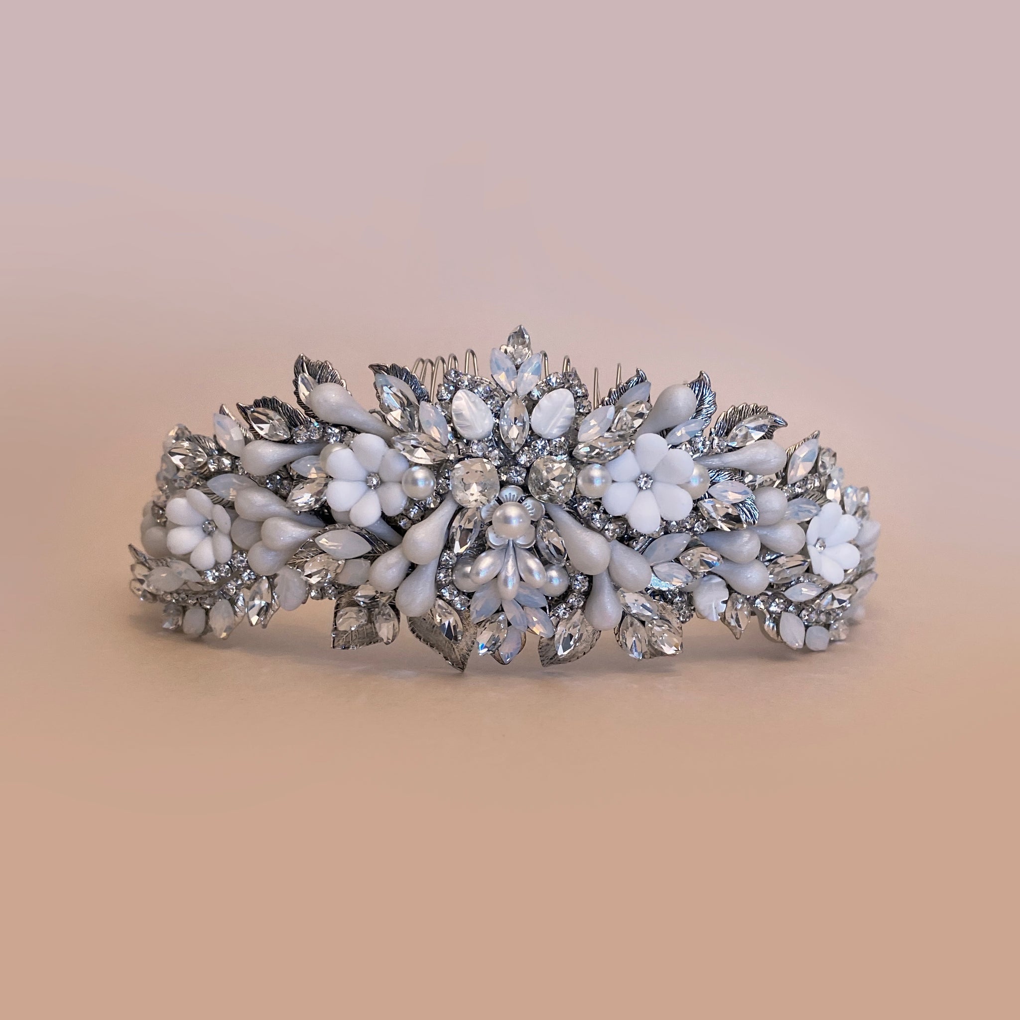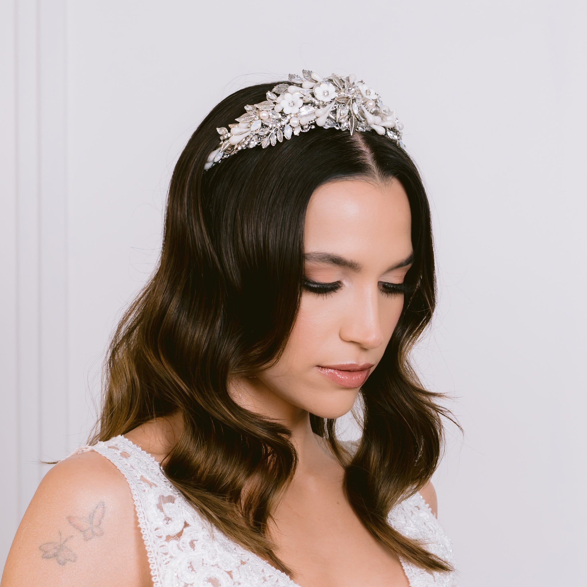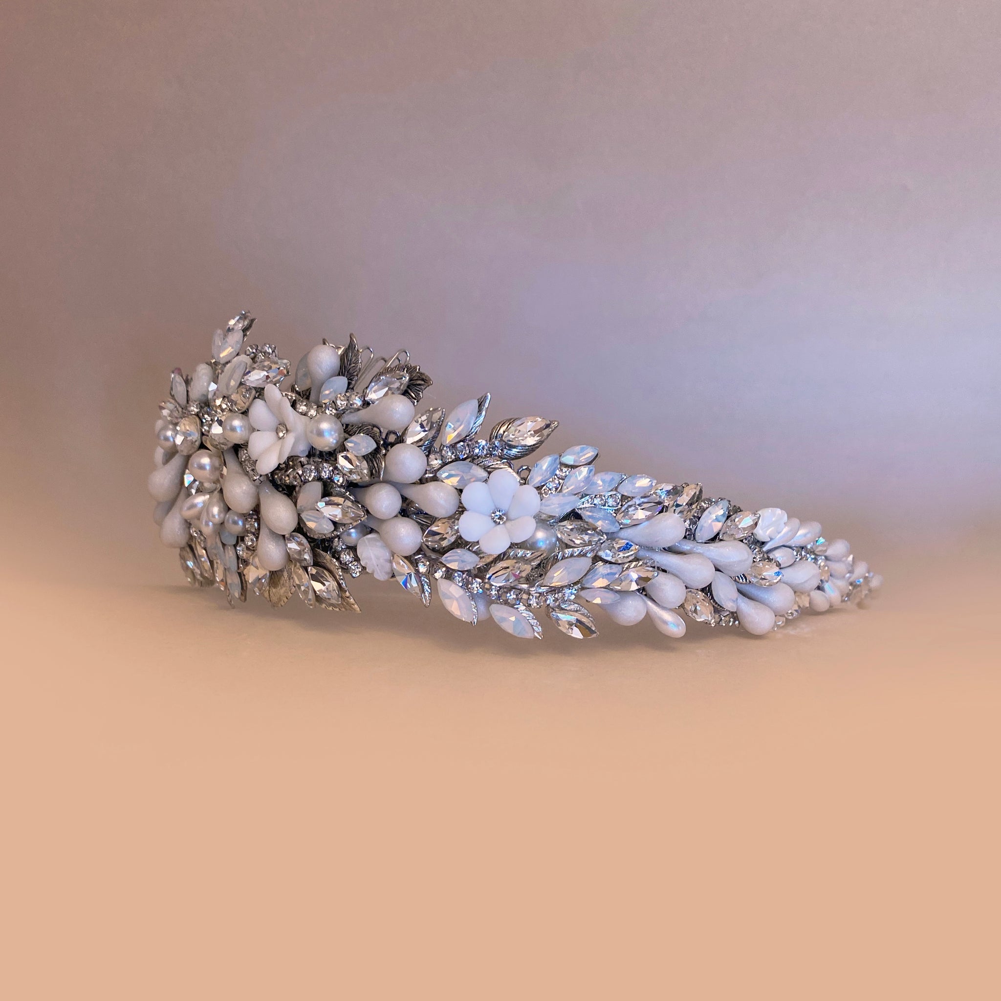 Corona/diadema única y hecha a mano por Ana Rebeca, adornada principalmente con flores de porcelana, azahares en tono perla, cristal Swarovski, y perlas en distintas presentaciones.