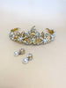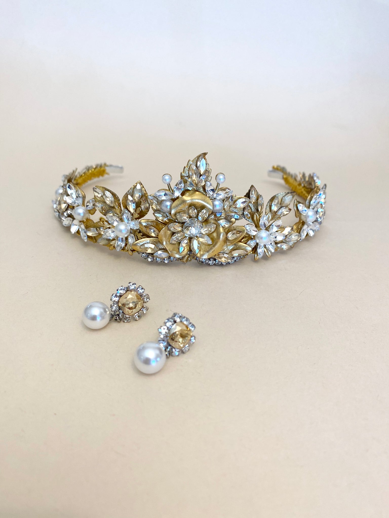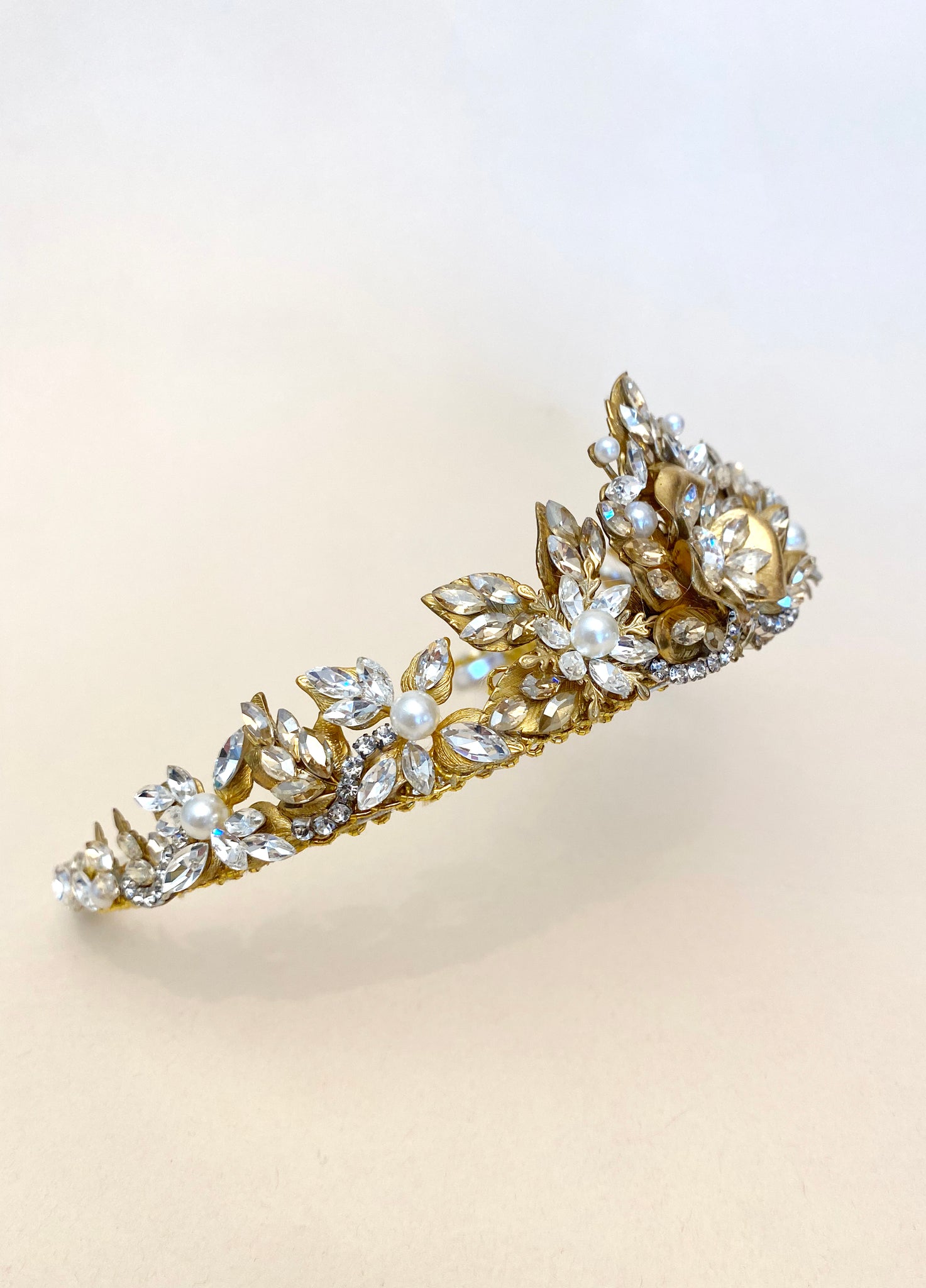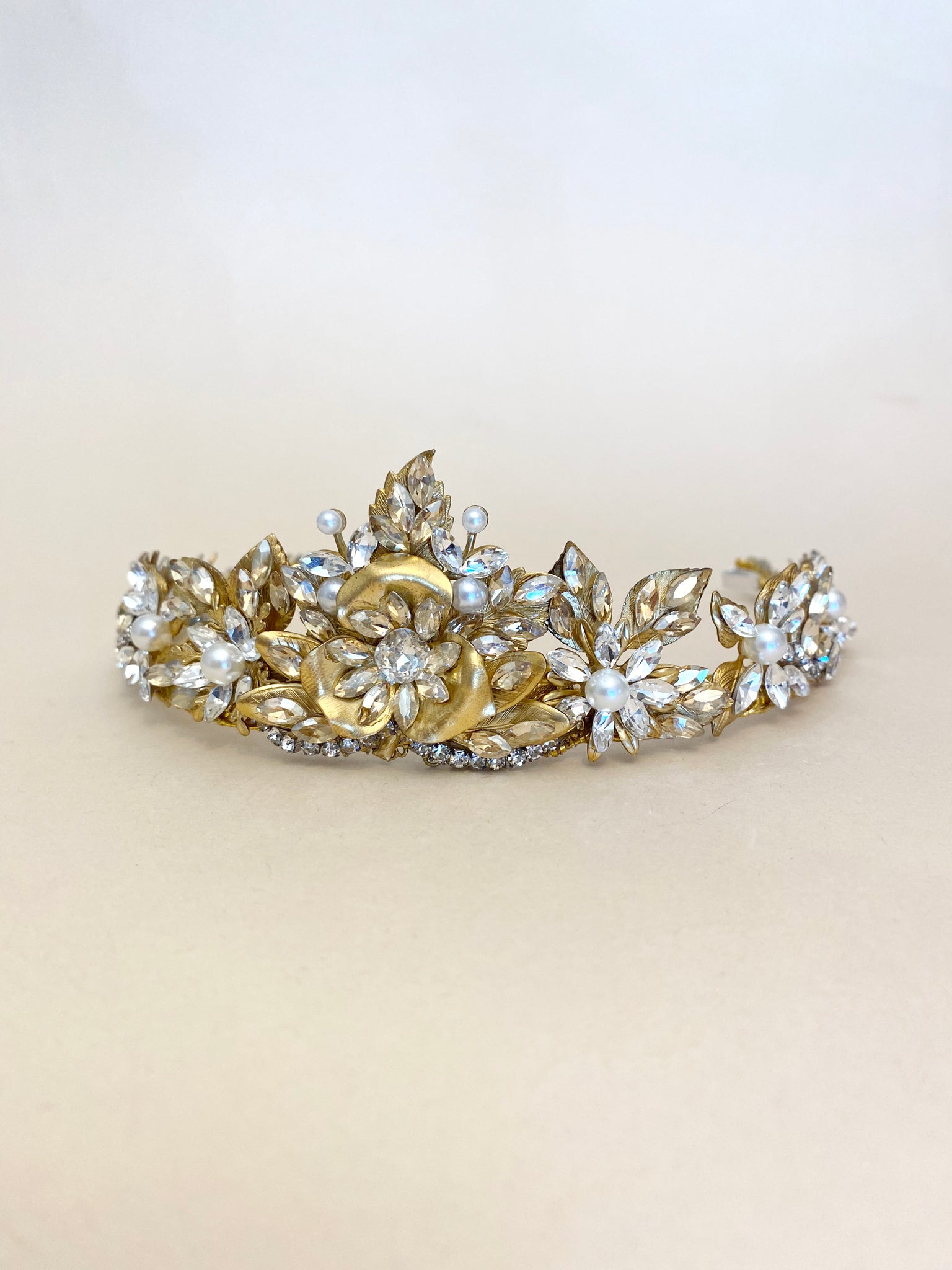Corona única y hecha a mano por Ana Rebeca, adornada con cristal Swarovski y perlas sobre base oro vintage.