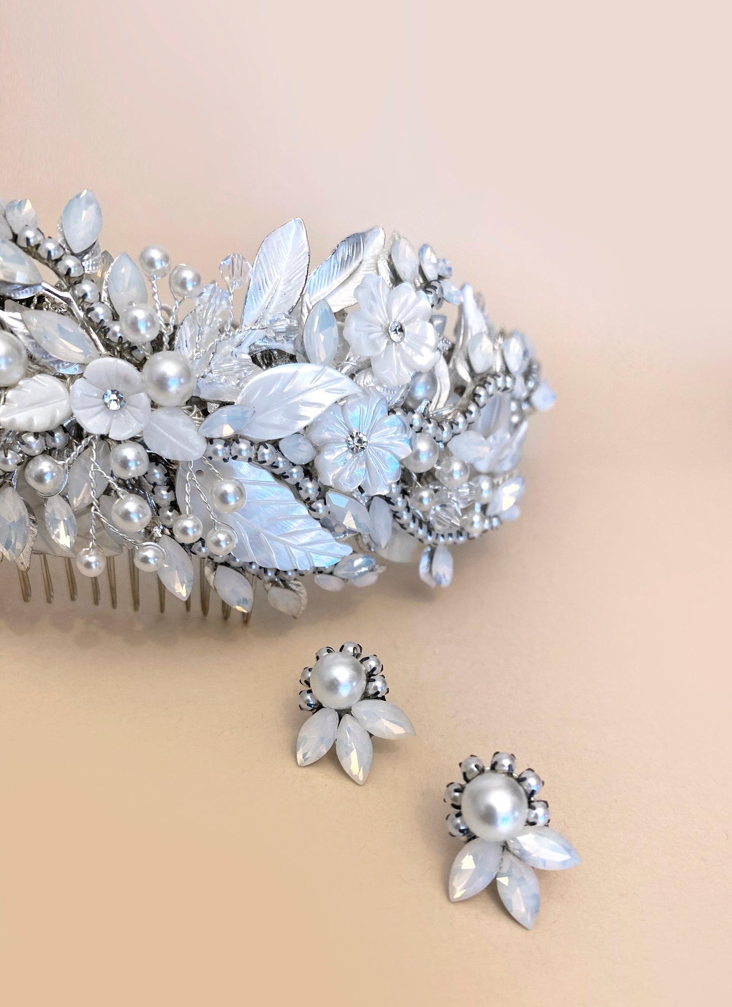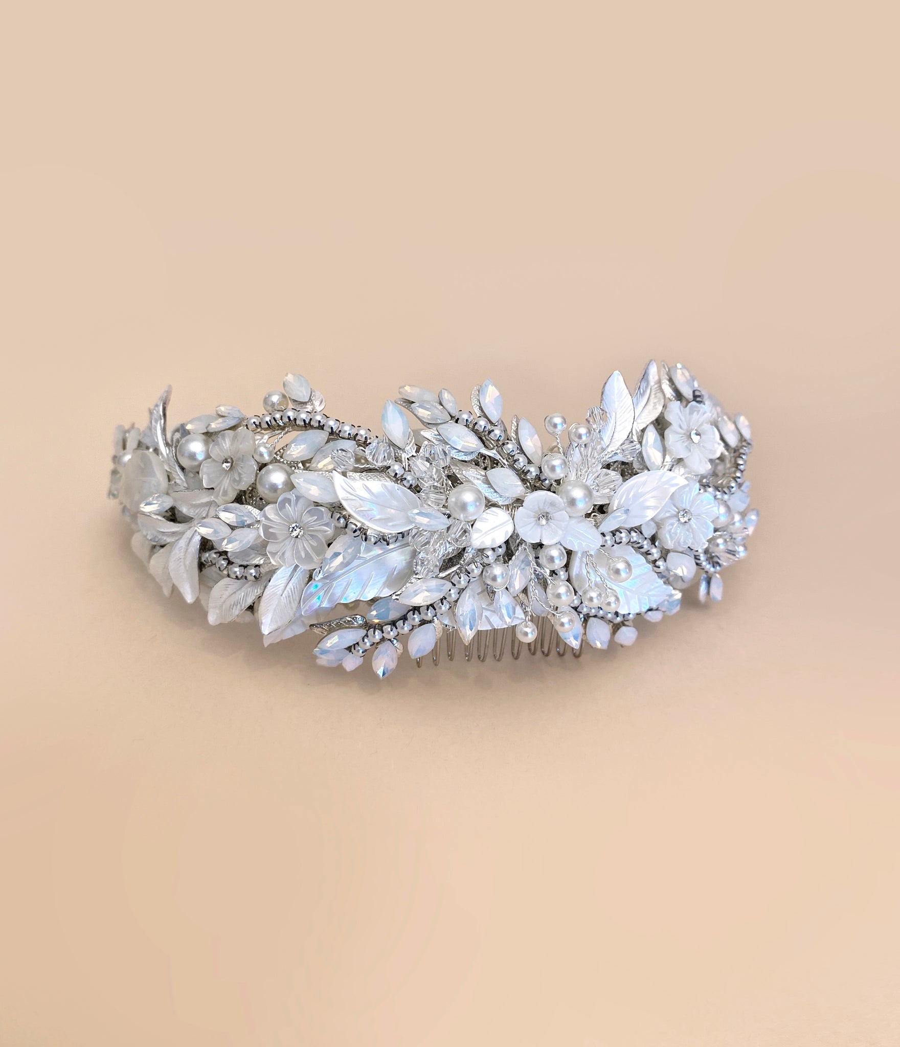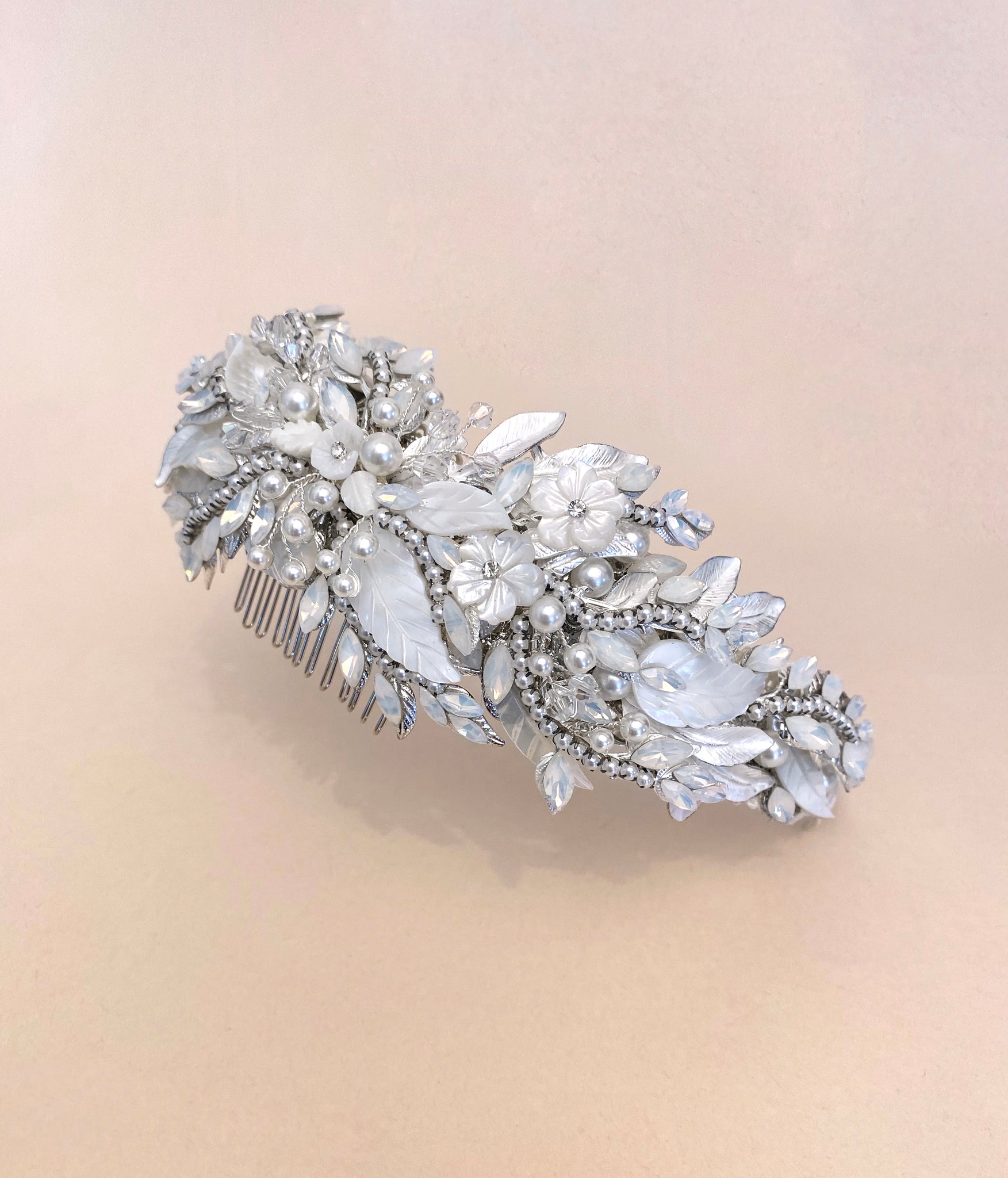 Diadema Bold única y hecha a mano por Ana Rebeca, adornada sobre base plateada con detalles en volumen, principalmente cristal Swarovski en tonos ópalo blanco y perlas en distintas presentaciones.