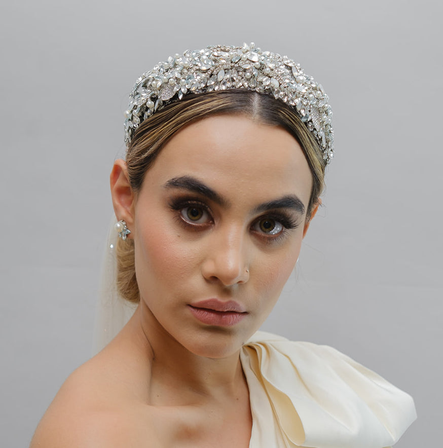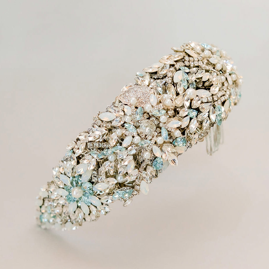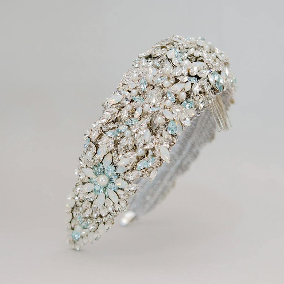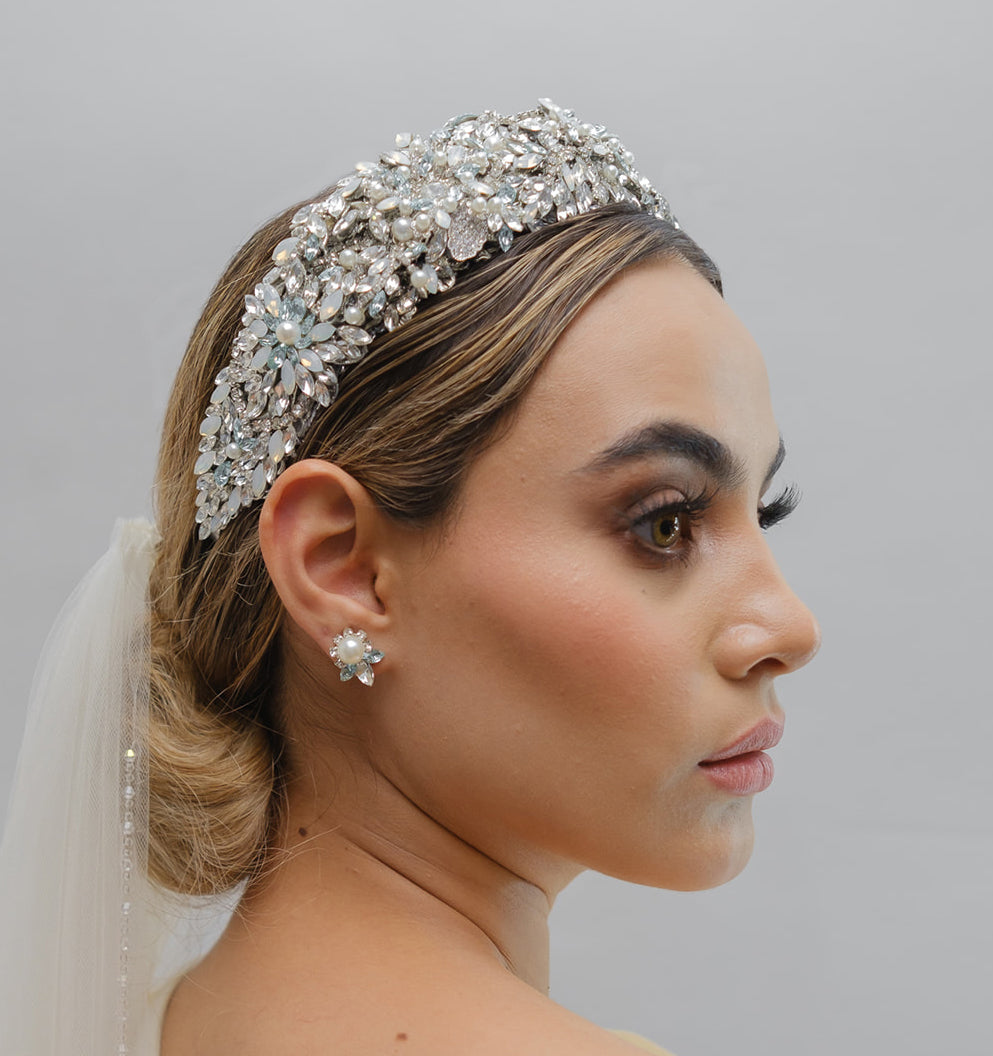 Diadema Bold estilo Contemporáneo Romántico, única y hecha a mano por Ana Rebeca, a base de metal plateado, adornado con cristales en tonos claro, ópalo blanco, azul aqua y perla.