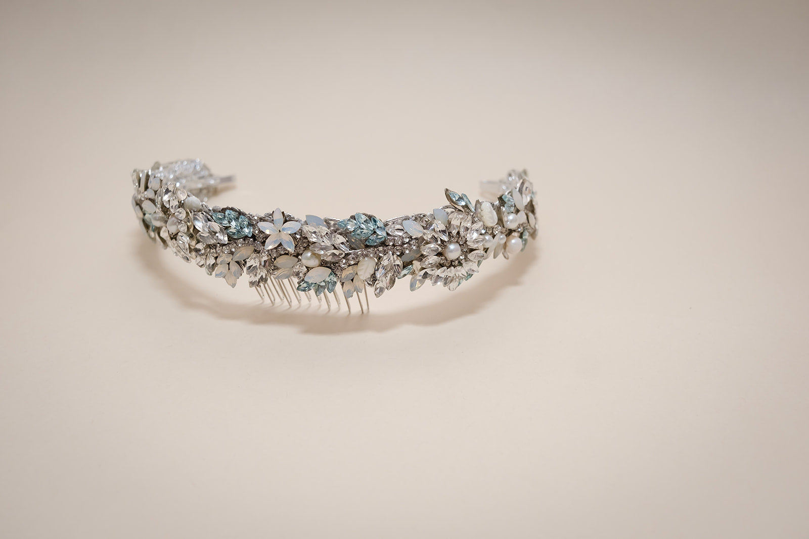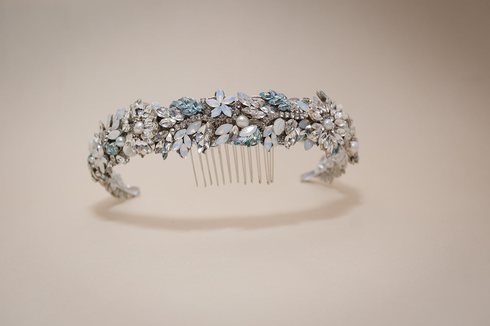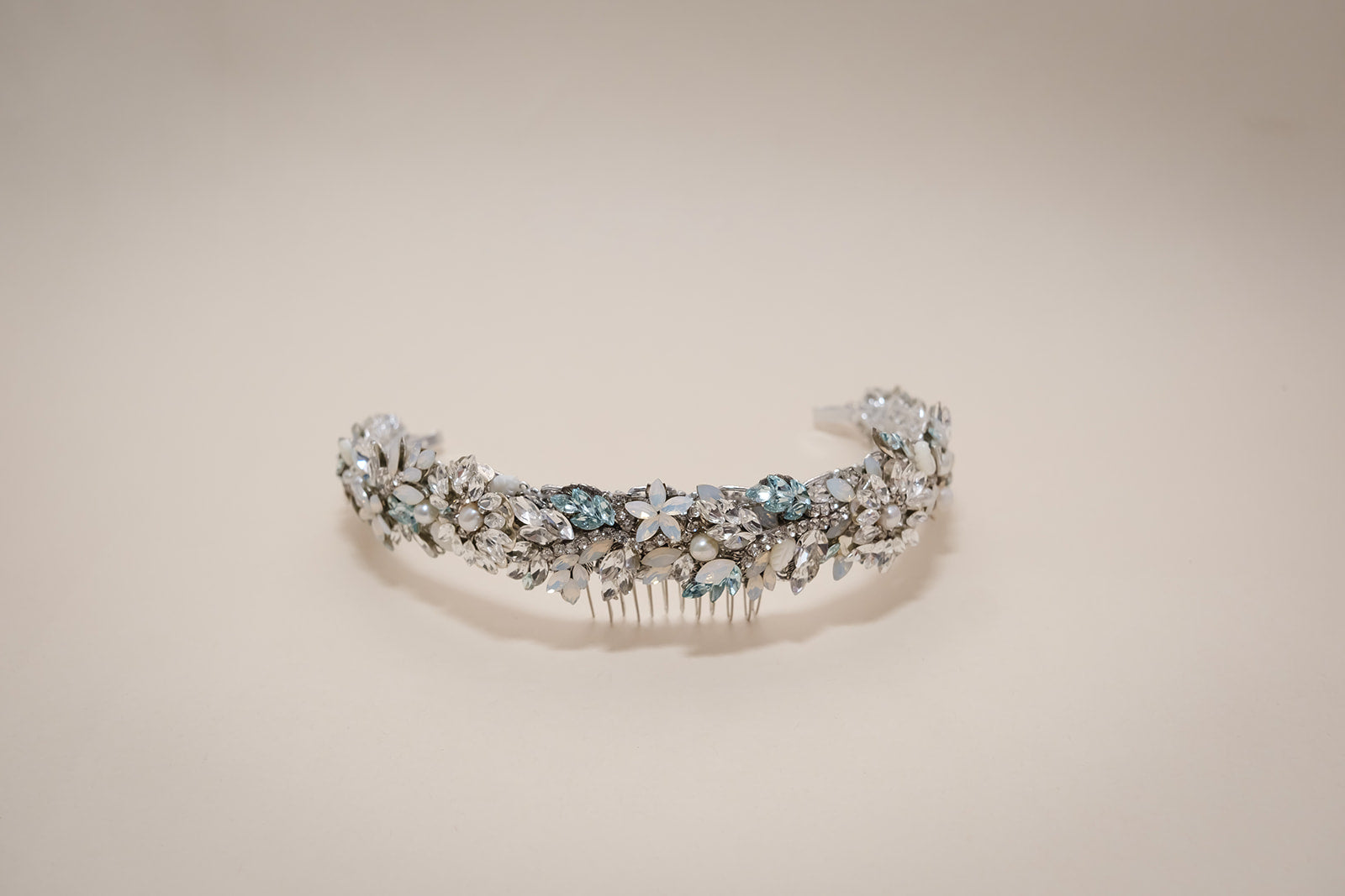 Diadema única y hecha a mano por Ana Rebeca, adornada principalmente con cristal Swarovski en tonos aqua, ópalo blanco y claro, y Perlas. Tonos a elegir.