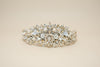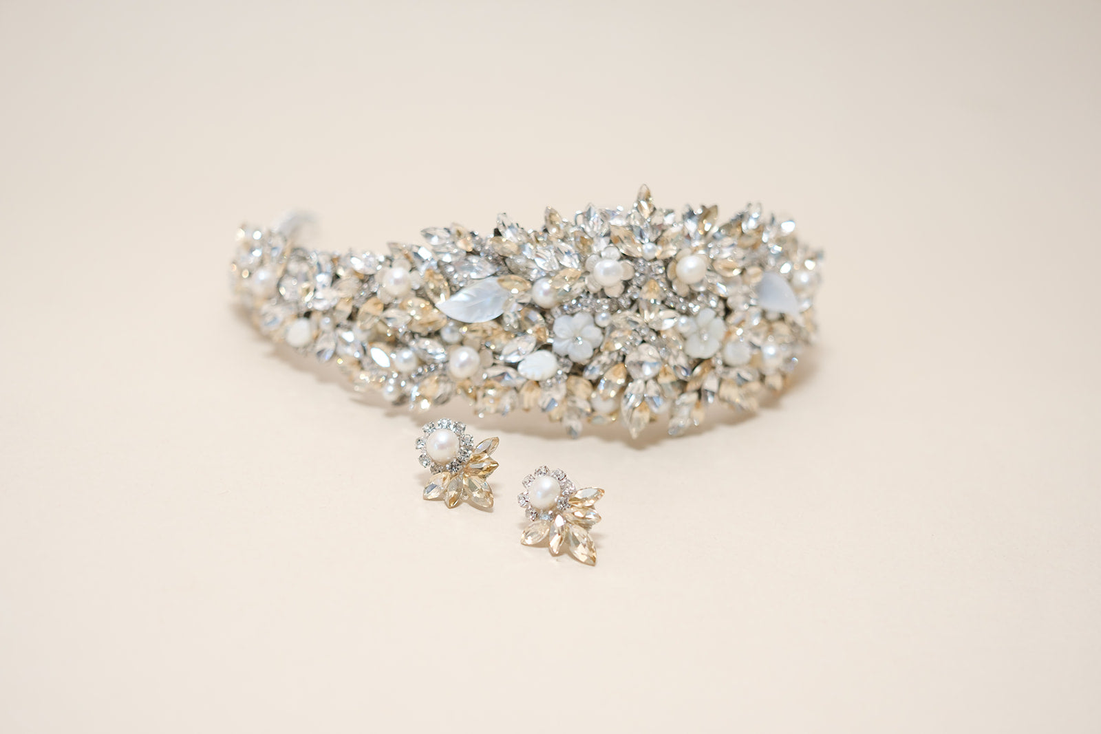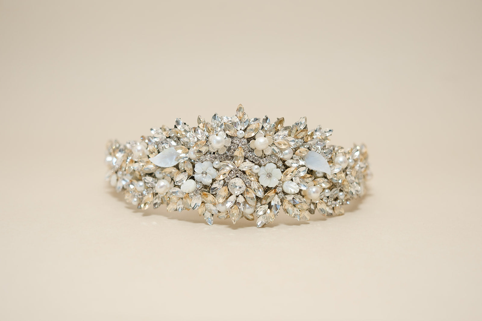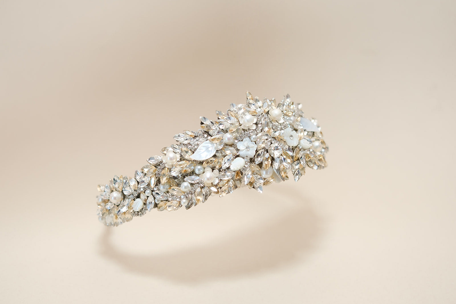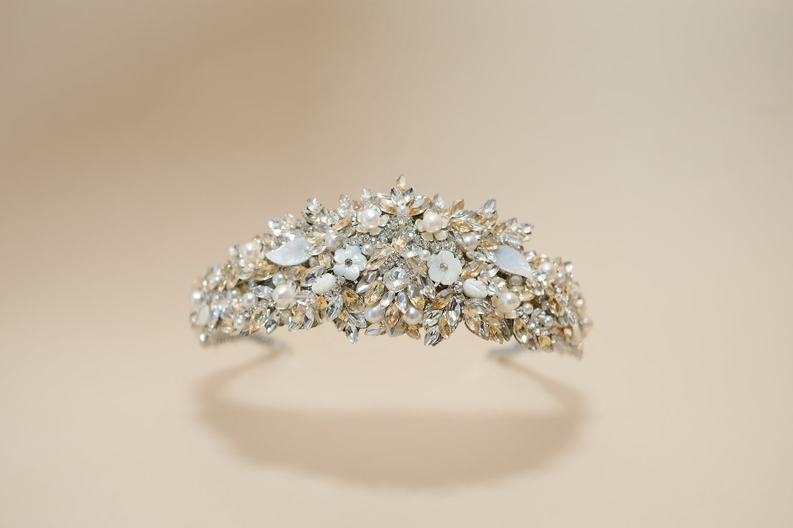 Corona/diadema, única y hecha a mano por Ana Rebeca, adornada principalmente con cristal Swarovski en tonos champagne, y perlas en distintas presentaciones.