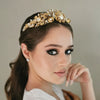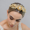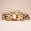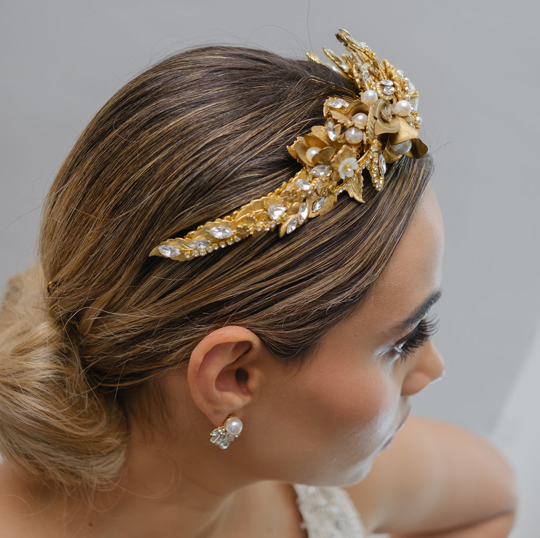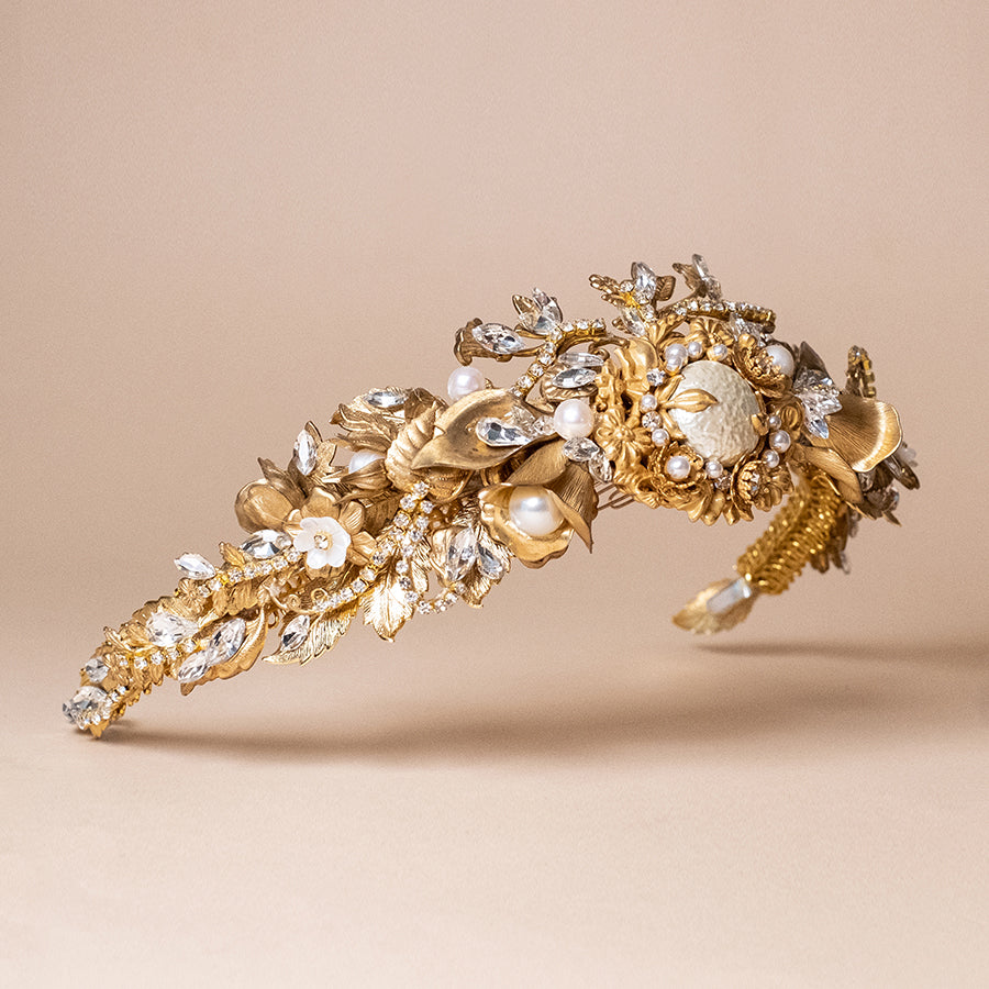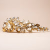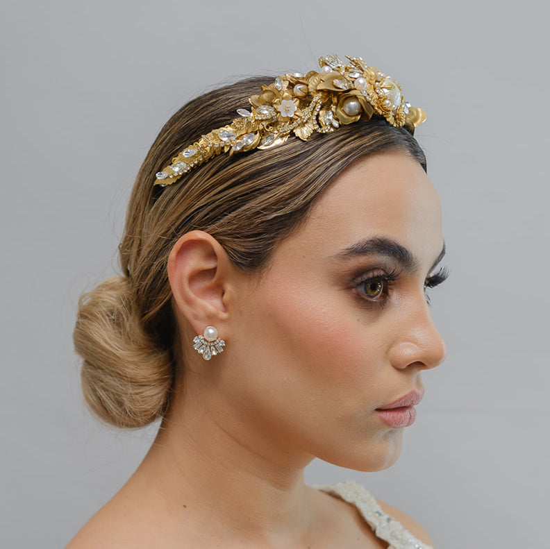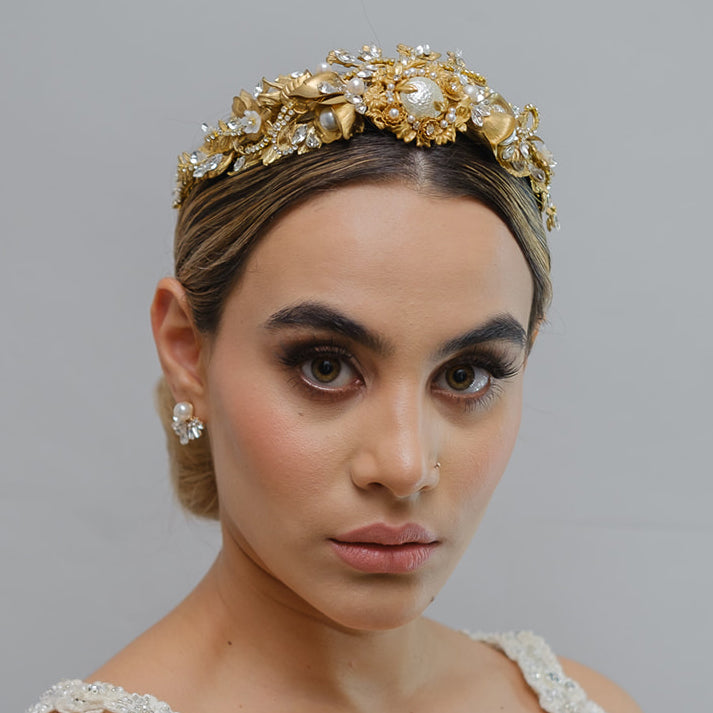 Corona Bold única y hecha a mano por Ana Rebeca, adornada sobre base en tono oro viejo con detalles en volumen, principalmente cristal Swarovski y perlas en distintas presentaciones. Se puede utilizar como Corona o Diadema.